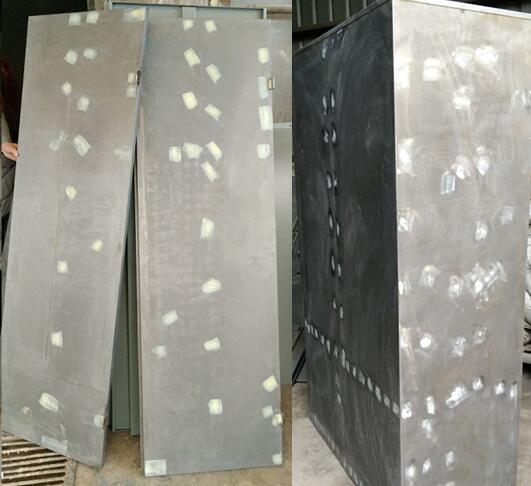 如图是 焊接的重型工具柜表面处理过程中的照片。有白点的地方都是厚板焊透后人工打磨凸起的钢板表面。只有工具柜内加强筋和柜体焊透才能保证固体的牢固性。每个焊点再采取汽车表面修补漆面的工艺,进行人工修补原子灰,再进行表面静电喷塑处理。